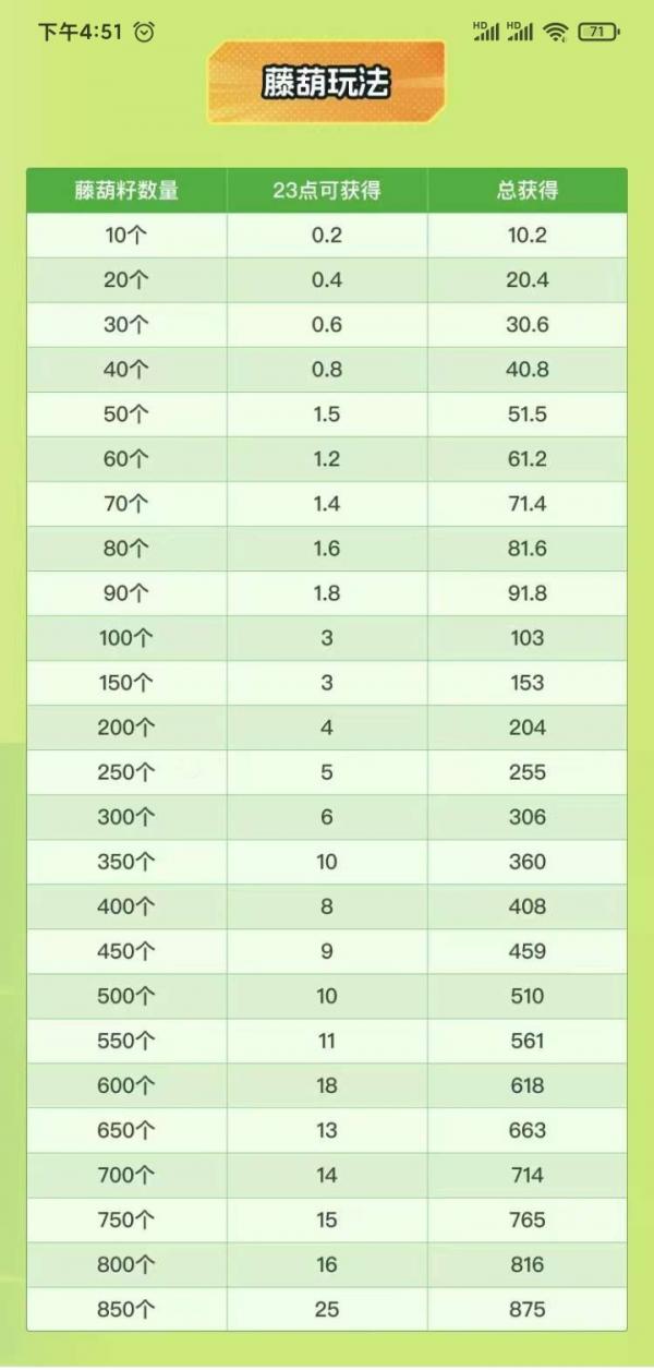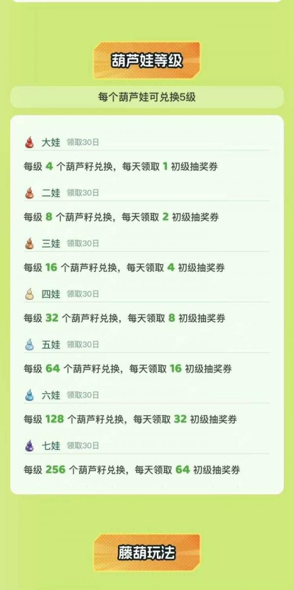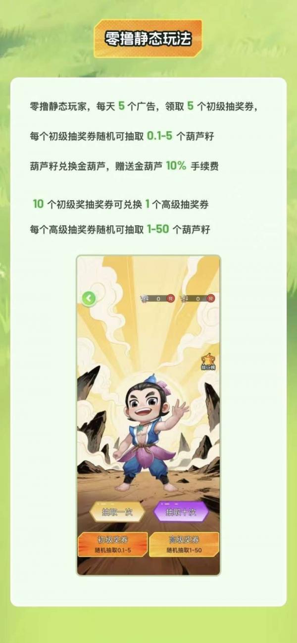 用户只需看5个广告,便能获得5张初级券,抽取1-50枚葫芦籽,葫芦籽可按1:1的比例兑换为金葫芦,平台以2圆/个进行回收金葫芦,整体玩法轻松,适合想要边玩边增收的用户。